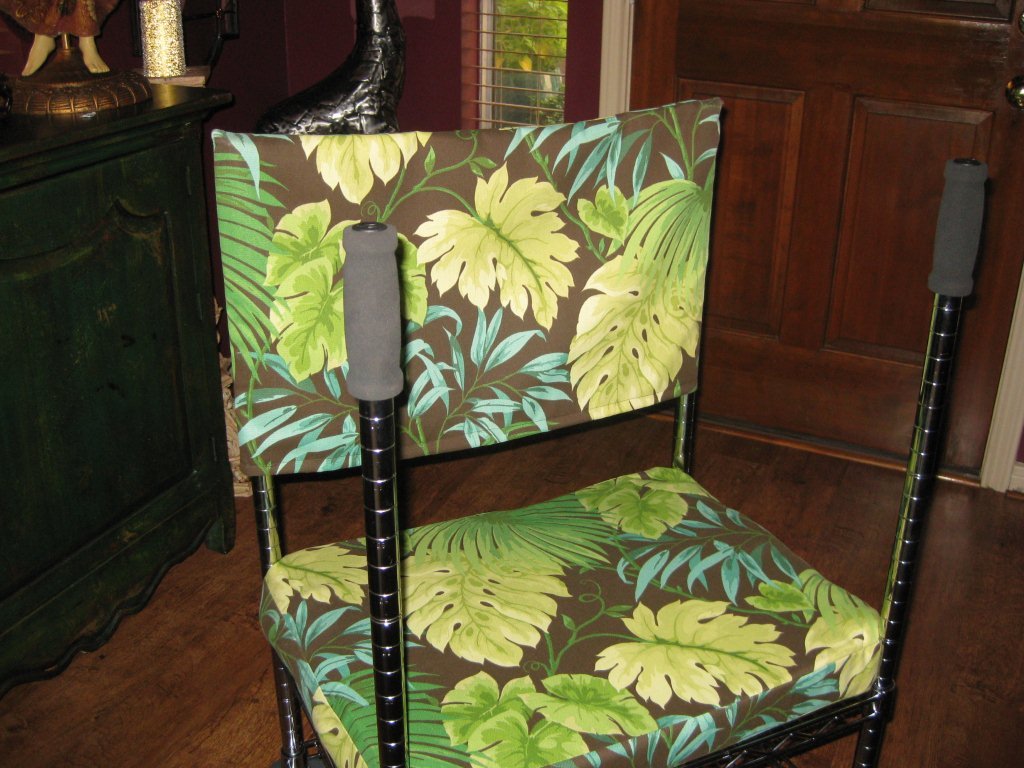 The Chairiot's seat cushion is made with 2" compressed foam rubber. The fabric used for the seat cover and back is outdoor canvas. The seat cover may be easily removed using the zipper and laundered with the back. Fabrics may vary due to availability.